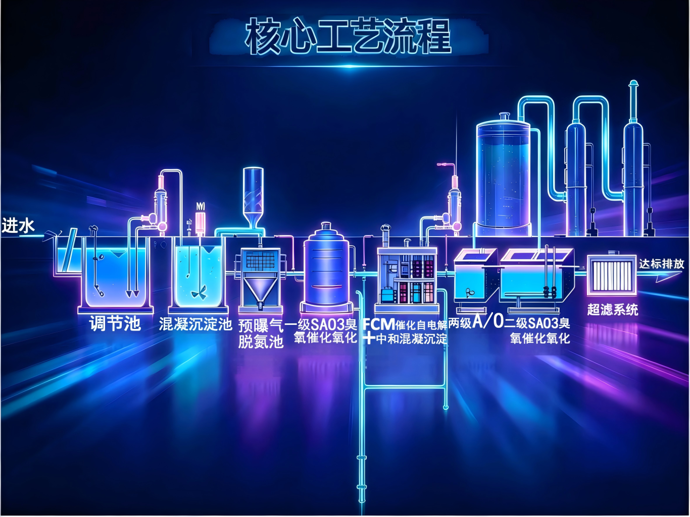 高效预处理(FCM-Ⅳ催化自电解+SAO3催化氧化耦合反应)+生化+深度处理技术,是与传统工艺结合的渗滤液全处理、无浓液回灌的终极解决工艺。该工艺通过“FCM-Ⅳ催化自电解+SAO3催化氧化耦合反应”对渗滤液行高效预处理,大幅度去除废水中COD、氨氮、总氮、总磷等负荷,为后段生化系统高效稳定运行创造有利条件。